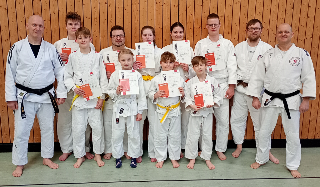 Am Ende der jeweils zweistündigen Prüfungen konnte Jens das Bangen der Prüflinge beenden und allen zur bestandenen Prüfung gratulieren. Alle konnten zeigen, dass sie die geforderten Techniken sicher beherrschen. Somit dürfen sich Annabelle und Irma den weiß-gelben und Richard, Loris, Anastasia, Maximilian und Michael zukünftig den gelben Gürtel umbinden. Über den orangenen Gürtel dürfen sich Felix, Leonard, Emil, Alexander und Clemens freuen. Den dritthöchsten Schülergrad – den grünen Gürtel – erreichten Jonathan und Richard.
